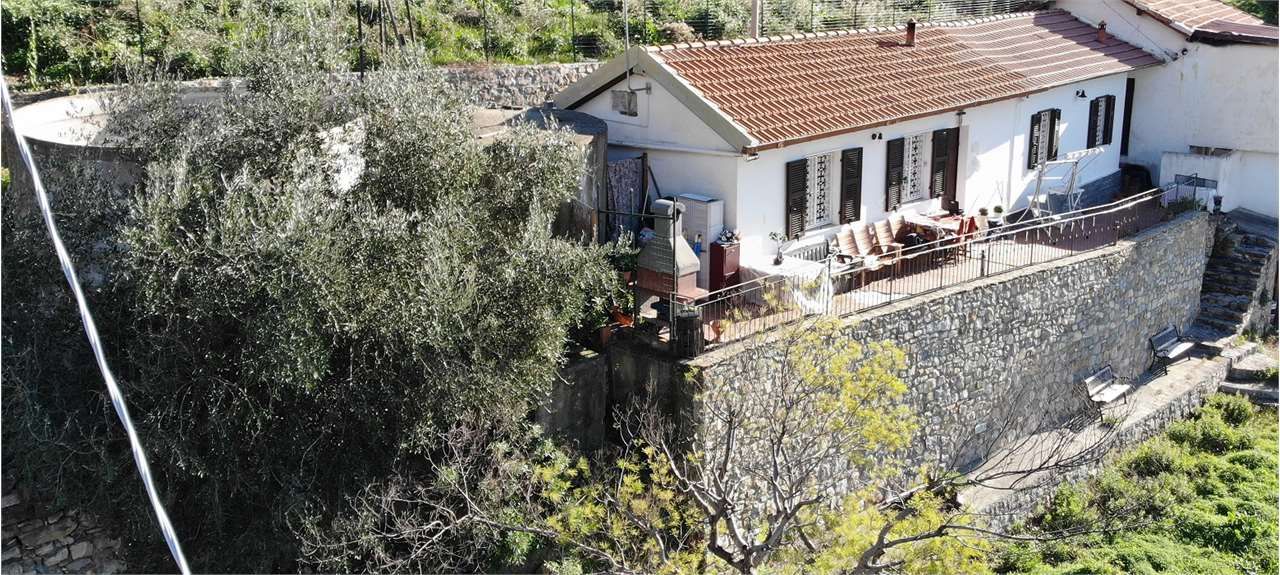 Sanremo zona San Martino casa indipendente in ordine composta da ingresso living nella cucina-tinello, soggiorno, due camere da letto matrimoniali, bagno con doccia, termo autonomo, grande cantina eventualmente ampliabile, oltre a terreno circostante di circa 1400 mq. esposto a sud-ovest con bella vista aperta sulla città e mare, nessuna spesa condominiale, ampia possibilità di parcheggio privato interno alla proprietà.