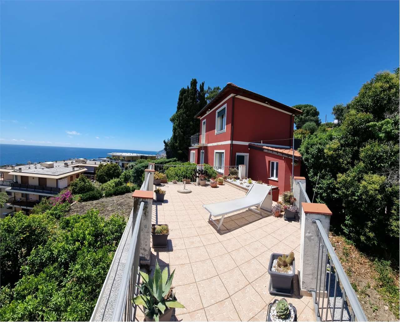 Sanremo quartiere san Martino graziosa villa indipendente su due livelli in posizione sopraelevata con splendida vista panoramica sul mare e circostante terreno pianeggiante di circa 800 mq. Al piano terreno la zona giorno composta da ingresso sala da pranzo salotto cucina bagno di servizio rispostiglio ed un ampia terrazza con bella vista mare, dall'ingesso tramite scala interna si accede alla zona notte del piano superiore con camera da letto matrimoniale camera singola bagno principale e balcone. Possibilità di aumentare la superficie residenziale ristruttrando e rendendo abitativi altri 45 mq. già accatastati come abitazione. Ulteriore possibilità di ampliamento della volumetria con demolizione parziale e ricostruzione.