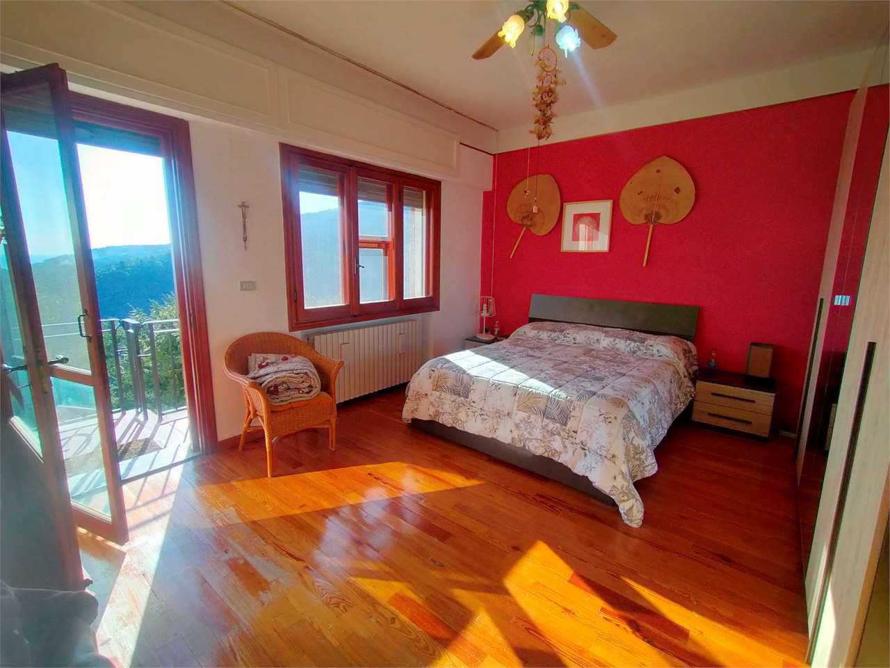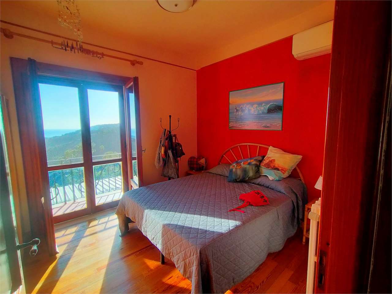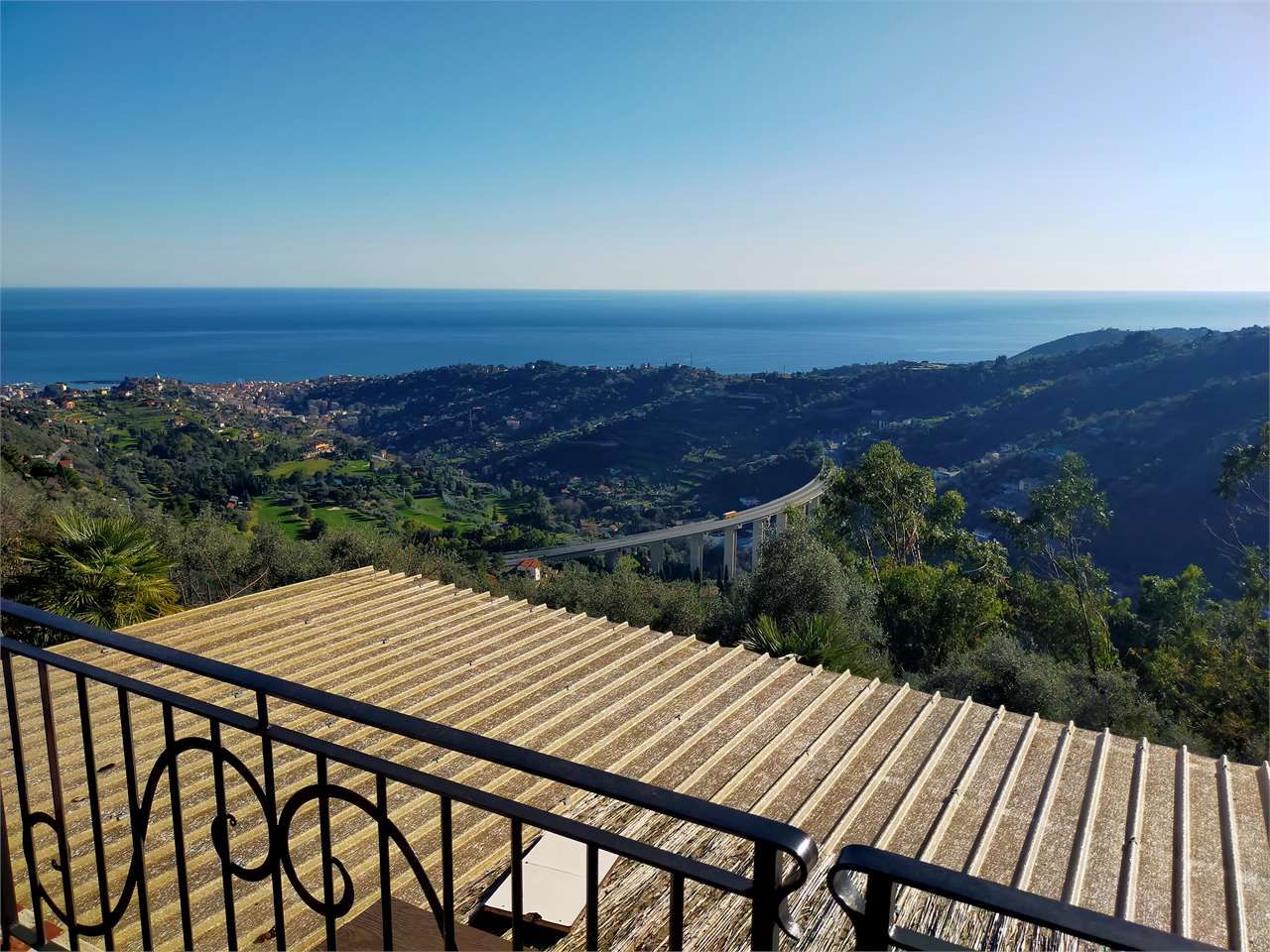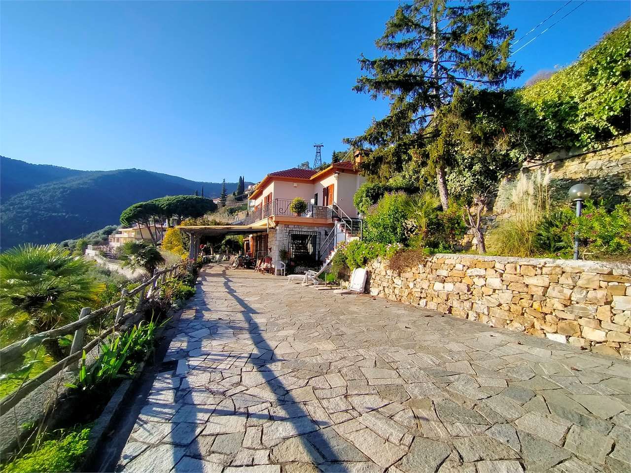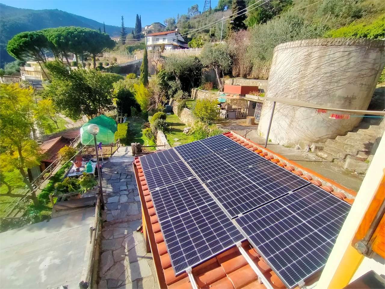 Sanremo sopra il campo golf con splendida vista sul golfo soleggiata ed esclusiva villa indipendente su due livelli circondata da circa 3000 mq. di terreno e frutteto con oltre 100 alberi tra piante da frutta ed olivi ed ampi spazi esterni. Cancello di ingresso carrabile su patio piastrellato con ampio spazio per i mezzi, cucina estiva oltre a magazzino deposito e due cantine. L'abitazione si compone al piano terra di porticato di ingresso soggiorno salotto con camino ventilato cucina a vista bagno di servizio e comoda scala interna al piano superiore, al prima piano due camere da letto matrimoniali camera singola bagno ripostiglio e terrazzo vivibile. Impianto fotovoltaico e sorgente d'acqua, presa di ricarica per auto elettrica, cappotto coibentante esterno, bassi consumi di gestione, alta classificazione energetica.