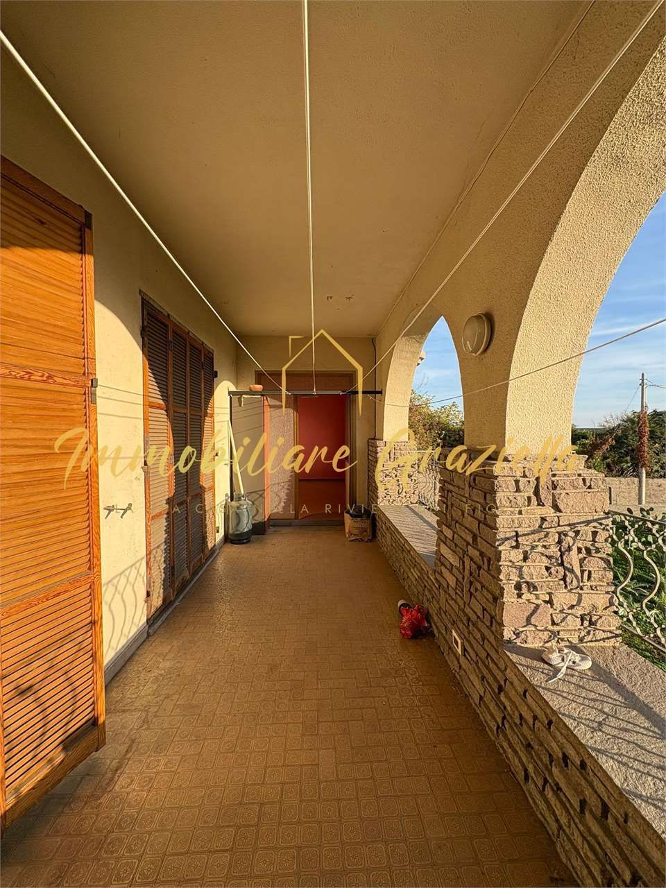 Accesso dalla corte esterna giardinata, con ampio portico coperto che avvolge due lati dell'abitazione. Internamente troviamo un luminoso soggiorno con cucina, due camere da letto, bagno, ripostiglio. Locale tecnico e due spaziose cantine.