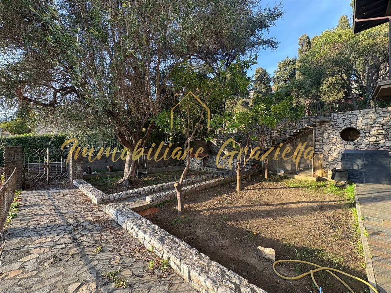 La proprietà è circondata da un curato giardino di circa 480 mq, completamente recintato e dotato di cancello carrabile, con due/tre posti auto privati davanti all'abitazione.
