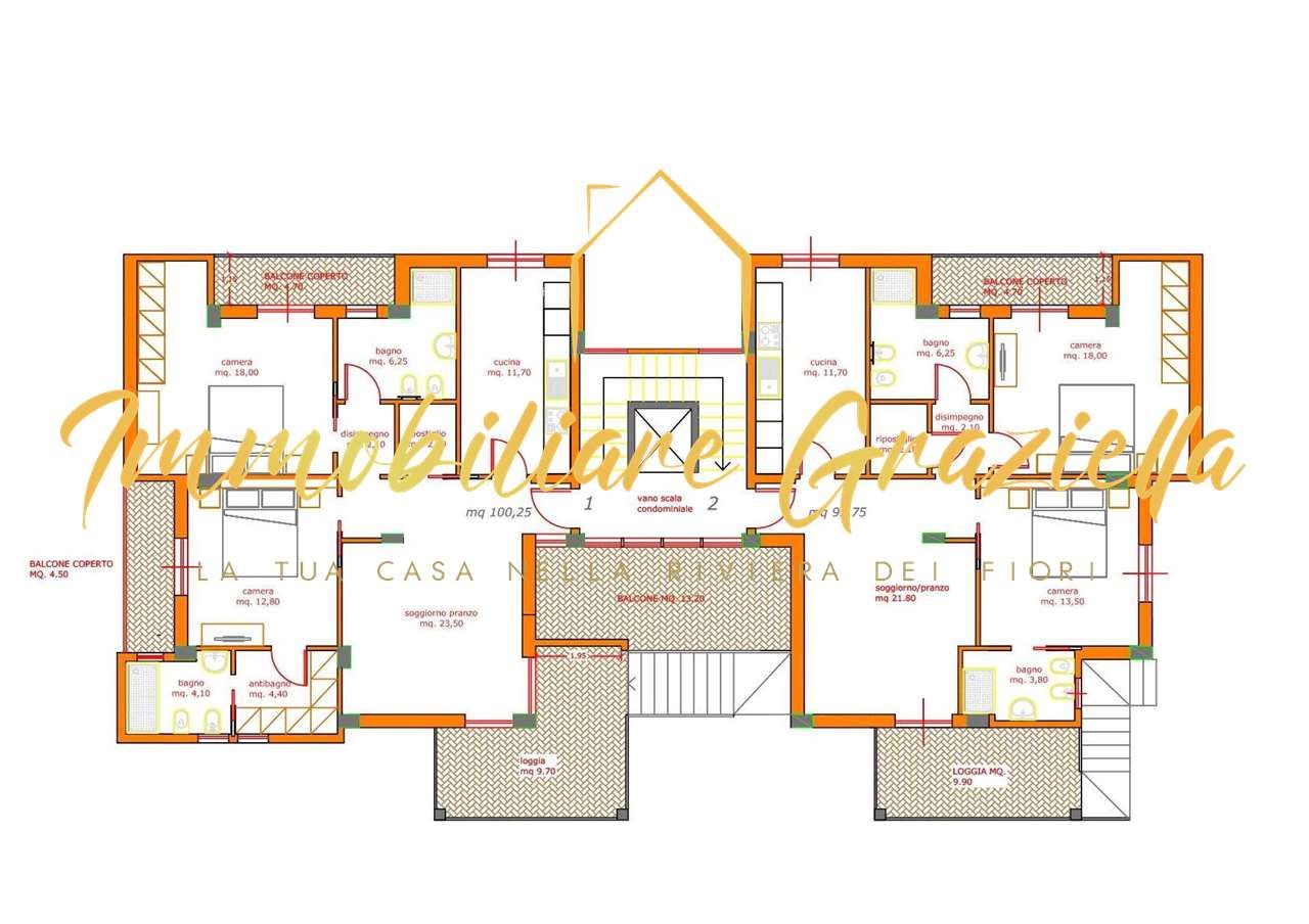 -APPARTAMENTO nuovo di mq 100, al primo piano (di 3) con ascensore, composto da: ingresso, soggiorno/pranzo, cucina, disimpegno, 2 camere da letto, doppi servizi, ripostiglio.