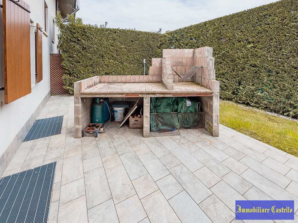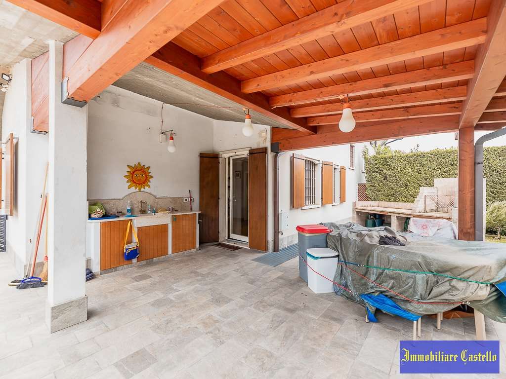 Ampio porticato che si apre su un giardino privato, completo di una zona barbecue, perfetta per cene e momenti conviviali all'aperto